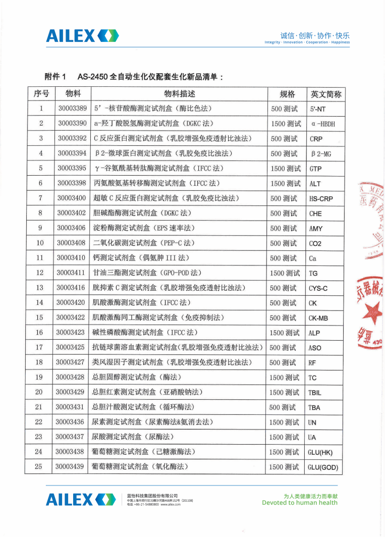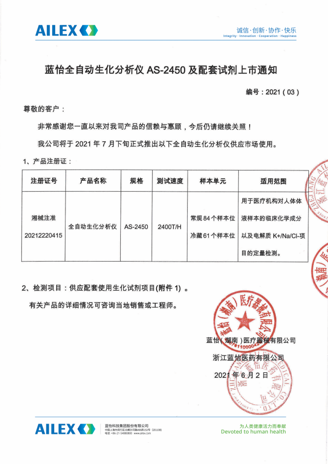 藍怡全自動生化分析儀AS-2450及配套試劑上市通知